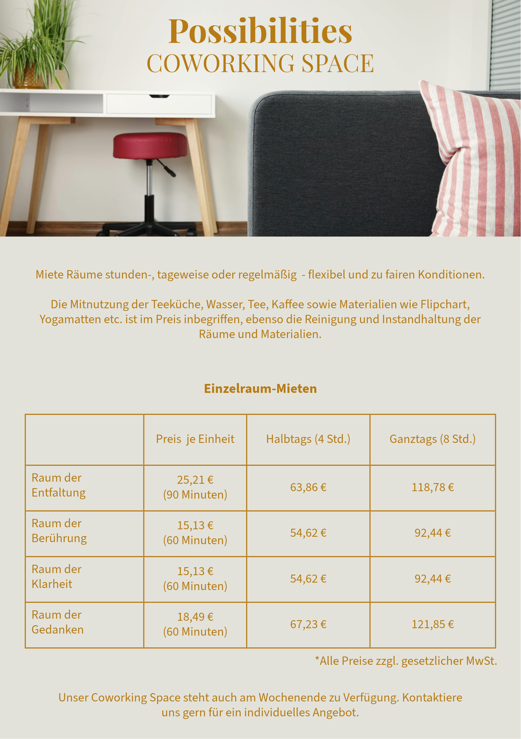 Bei Possibilities kannst du stunden-, tageweise oder regelmäßig Räume mieten - transparent, flexibel und zu fairen Konditionen. Die Mitnutzung der Teeküche, Wasser, Tee, Kaffee sowie Materialien wie Flipchart, Yogamatten etc. ist im Preis inbegriffen, ebenso die Reinigung und Instandhaltung der Räume und Materialien.