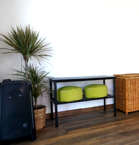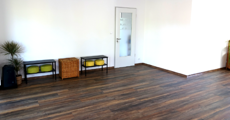 Ausstattung: Holzboden, große Fenster, Yogamatten, Decken, Kissen, Bestuhlung möglich, Musikanlage, Flipchart